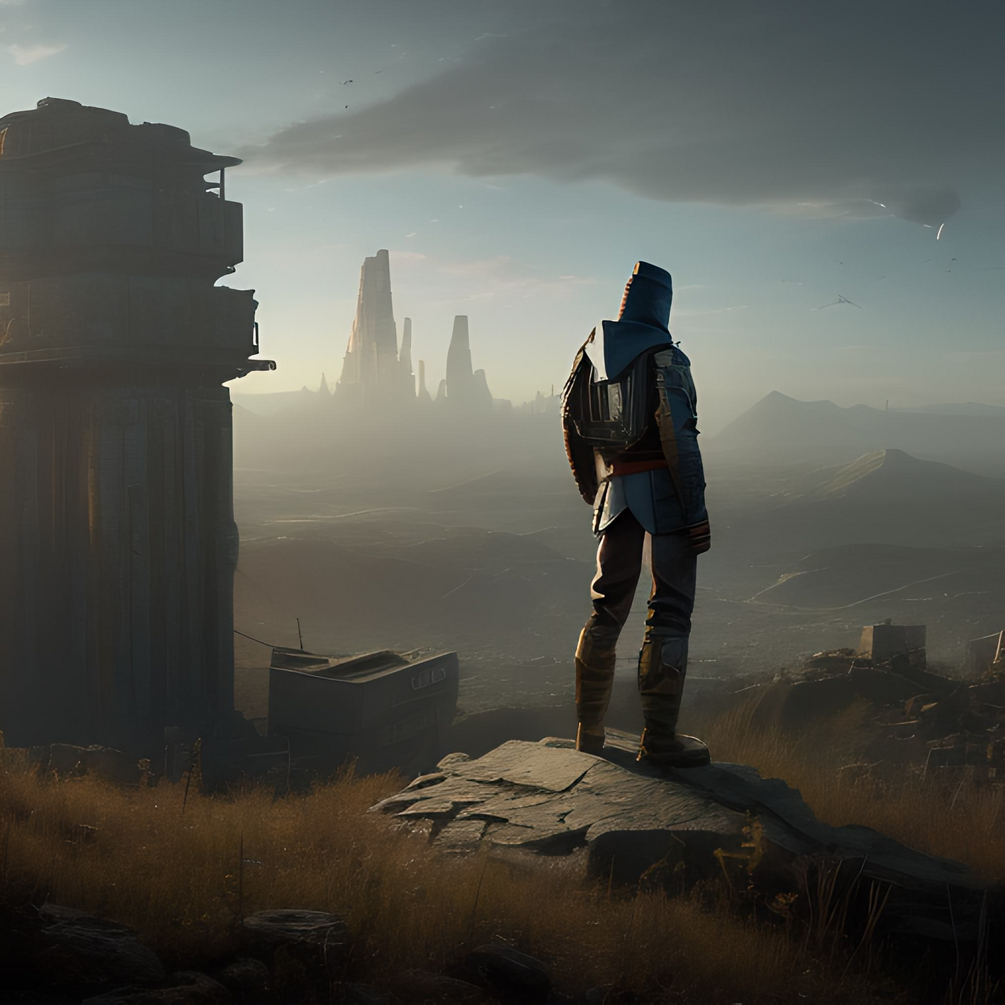 a hooded adventurer standing on a hill overlooking the ruins of a postcyberpunk city.